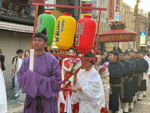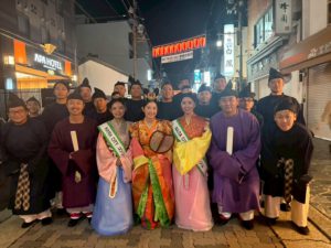 その後、奈良采女祭りの始まりとなる花扇奉納行列に参加し、天平衣装に着替えたメンバーはJR奈良駅から猿沢池ほとりの采女神社まで歩きました。